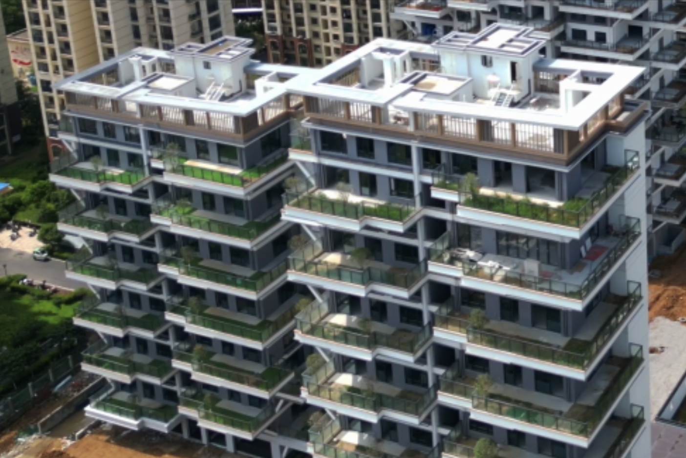 Meanwhile, the sky gardens of the Su Ling Ting Residence now present a lush, evergreen ecological landscape. Each floor features private courtyards and shared green terraces planted with succulents, shade-tolerant plants, and low shrubs, forming a three-dimensional vertical greening system. Notably, despite prolonged exposure to rain, sunlight, and potential root penetration, the waterproofing layer showed no blistering, cracking, or failure, maintaining excellent structural integrity and durability.