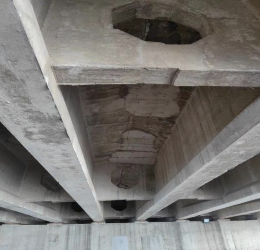 The total bridge length is approximately 551 m, with a structural configuration of 8 × 25 m + 2 × 35 m + 9 × 25 m prestressed T-beams. The bridge width is 27.5 m, consisting of (from west to east) 1.5 m sidewalk + 24.5 m carriageway + 1.5 m sidewalk. During routine maintenance, irregular fine cracks were found in the prestressed T-beams of the northern approach section. Due to the bridge’s age, localized concrete reinforcement exposure and rust expansion were also observed. Although these issues do not immediately affect structural safety or normal traffic operation, they deteriorate the durability and appearance of the bridge, thereby shortening its service life.